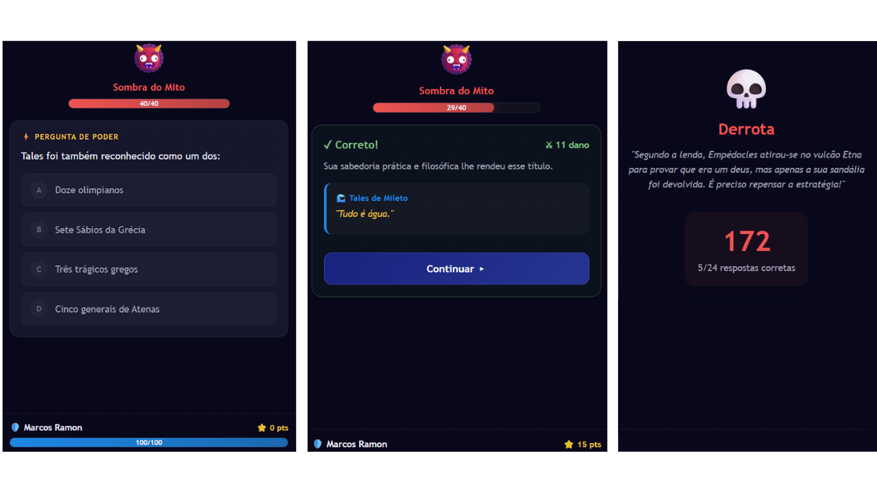 - uma arena de batalha, em que os estudantes fazem login automático com o número de matrícula, escolhem os filósofos (com pontos de ataque) e batalham contra inimigos (respondendo as questões) tentando chegar ao final sem perder todo o hp;